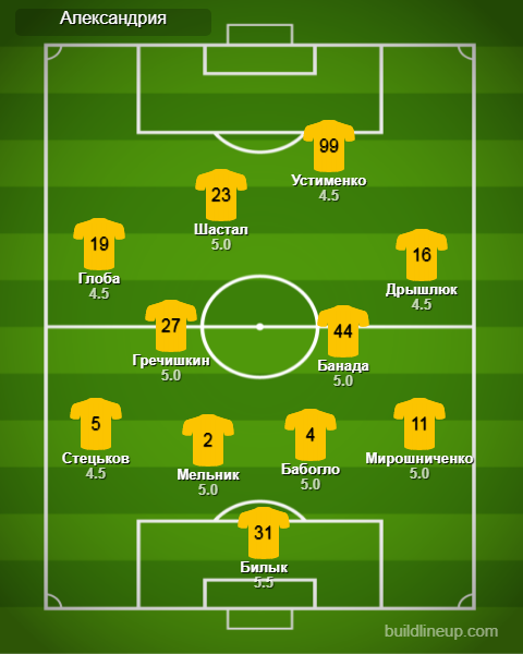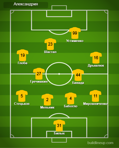 «Александрия»: Билык, Мельник, Бабогло, Стецьков, Мирошниченко, Гречишкин, Дрышлюк (Бондаренко, 62), Глоба (Вантух, 46), Банада, Шастал (Новиков, 62), Устименко (Ковалец, 46)